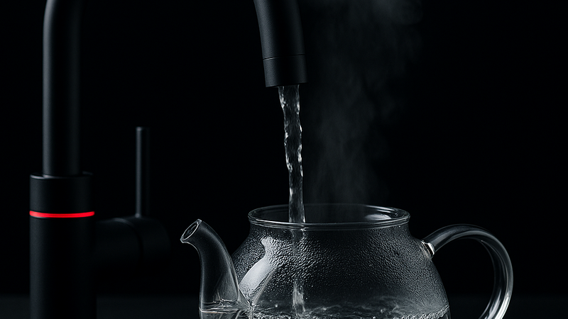 Kochendes Wasser fließt direkt aus dem Hahn für sofortige Verwendung.